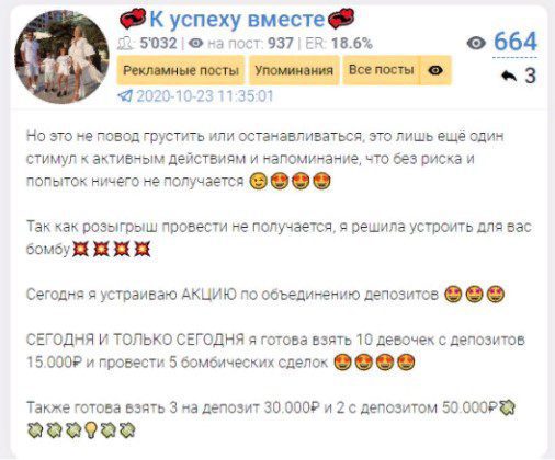 Главным направлением работы проекта К успеху вместе остается услуга по раскрутке депозита. Как пишут в отзывах, Ирина Высоцкая обещает помочь любому заработать, ведь она трейдер-профессионал и умеет обращаться с капиталом. Слой аудитории, по которому активно работает эта мадам – молодые мамы в декретном отпуске и девушки в поисках дополнительного дохода.