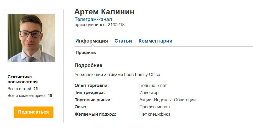 В блоге Артема на сайте ru.investing.com указано, что он имеет опыт торговли более пяти лет и является управляющим активами Leon Family Office. Также говорится и том, что он торгует акциями, облигациями и индексами. В блоге он выкладывает статьи о том, куда стоит инвестировать, а также свои предположения по поводу будущего мировой экономики.