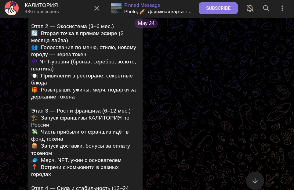 В телеграме мы увидели дорожную карту по токену $KALITORIYA. Первый этап — запуск токена на Blum, разработка скидочных программ для владельцев монет. Здесь же старт социальных сетей ресторана ООО «Калитория». Второй — интеграция голосования, NFT-уровней, привилегий в ресторане и выдача секретных блюд холдерам.Третий этап — рост и запуск франшизы. Здесь же разработчик планирует выделять часть доходов в фонд выкупа токена. На этом этапе создатель отмечает, что запустит персональный мерч, а также будет проводить оффлайн встречи.