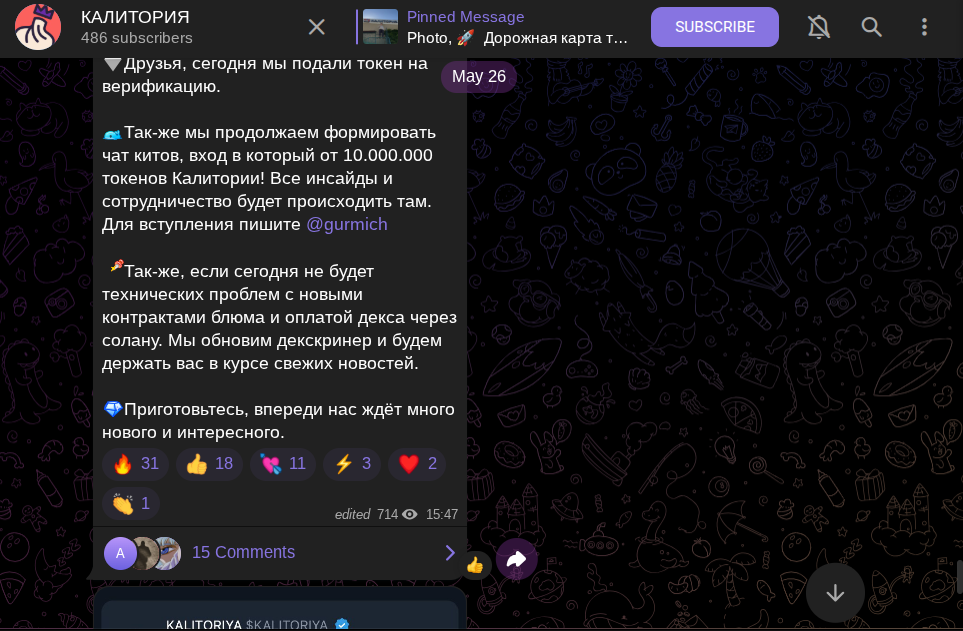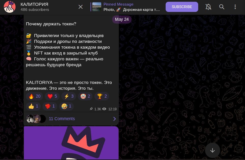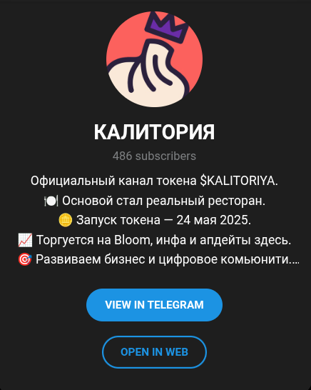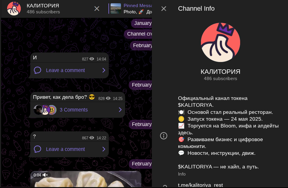 Админ сообщил тикер токена — $KALITORIYA, рассказал о планах развить бизнес-инфраструктуру. Также разработчик отметил, что монета не хайп, а путь к развитию цифрового комьюнити. На базе мессенджера канал работает с 7 января, однако контент админ публикует с 5 февраля 2025 года.