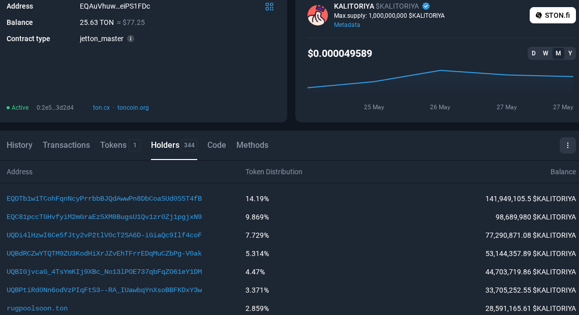 Мы «пробили» проект ресторана ООО «Калитория» и rest token Kalitoriya через Tonviewer и выяснили реальную стоимость. На данный момент, после хайпа цена токена составляет 0.000049589 доллара.