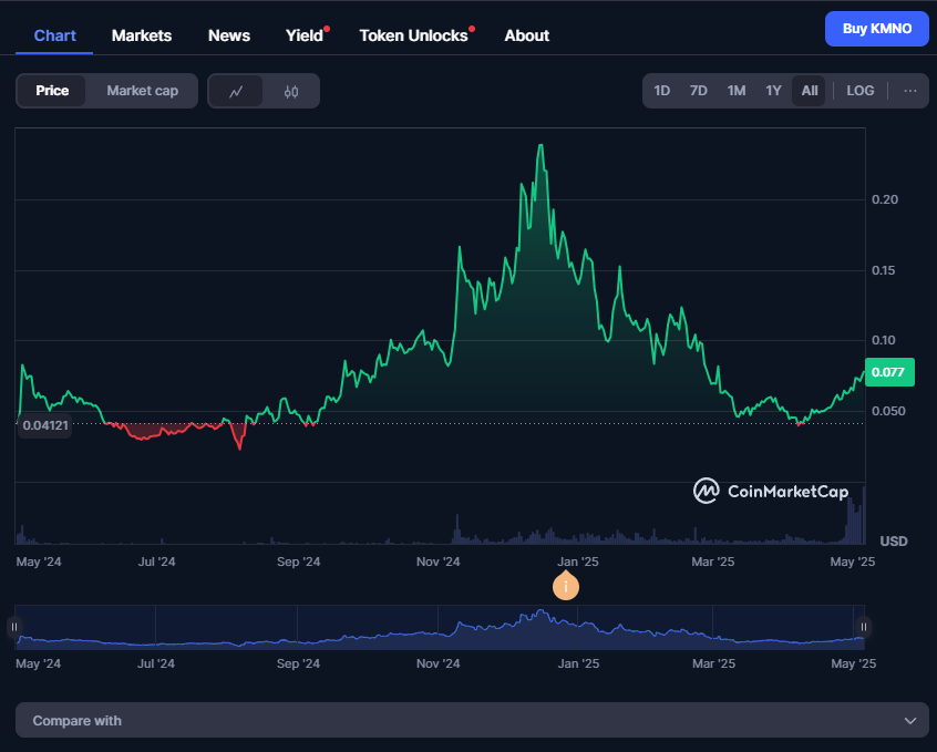 В мае 2025 года в обращении находится 1,35 миллиарда токенов. Рыночная капитализация монеты KMNO оценивается в 103+ миллиона долларов. Торговые объемы превышают рыночную капитализацию примерно на 20%.