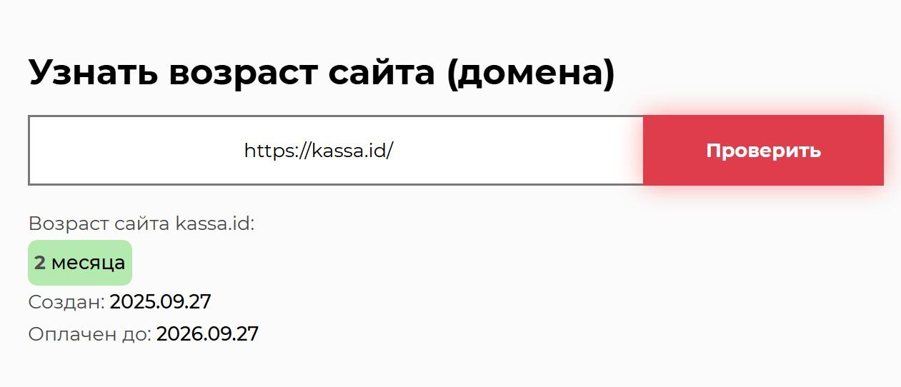 Официальный сайт Kassa Id – kassa id. На момент написания обзора он недоступен. Благодаря сохраненной копии в веб-архиве стало очевидно, что это копия сайтов kassa is и kassa cc. Из всех доменов удалось открыть только kassa is. Заявлено, что сервис работает с 2016 года. Но два домена созданы в ноябре 2025-го, а дату регистрации третьего установить не удалось, характеристики скрыты. Это выглядит странно.