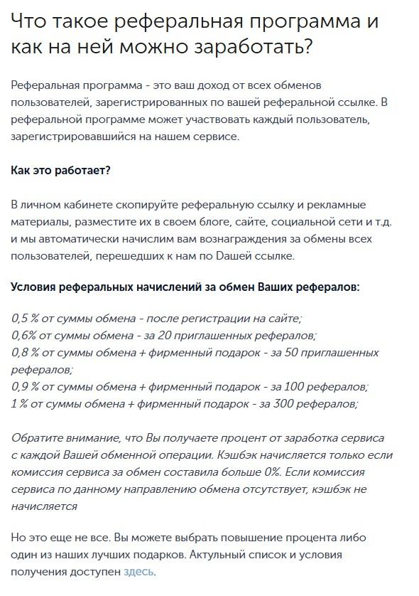 У проекта есть реферальная программа. Вознаграждение от 0,5% до 1% в зависимости от числа приглашенных людей. Рассчитывается оно от суммы обмена реферала. Для каждый валюты установлен свой минимальный размер вывода, например, для рубля – 150, доллара – 3, евро – 3.