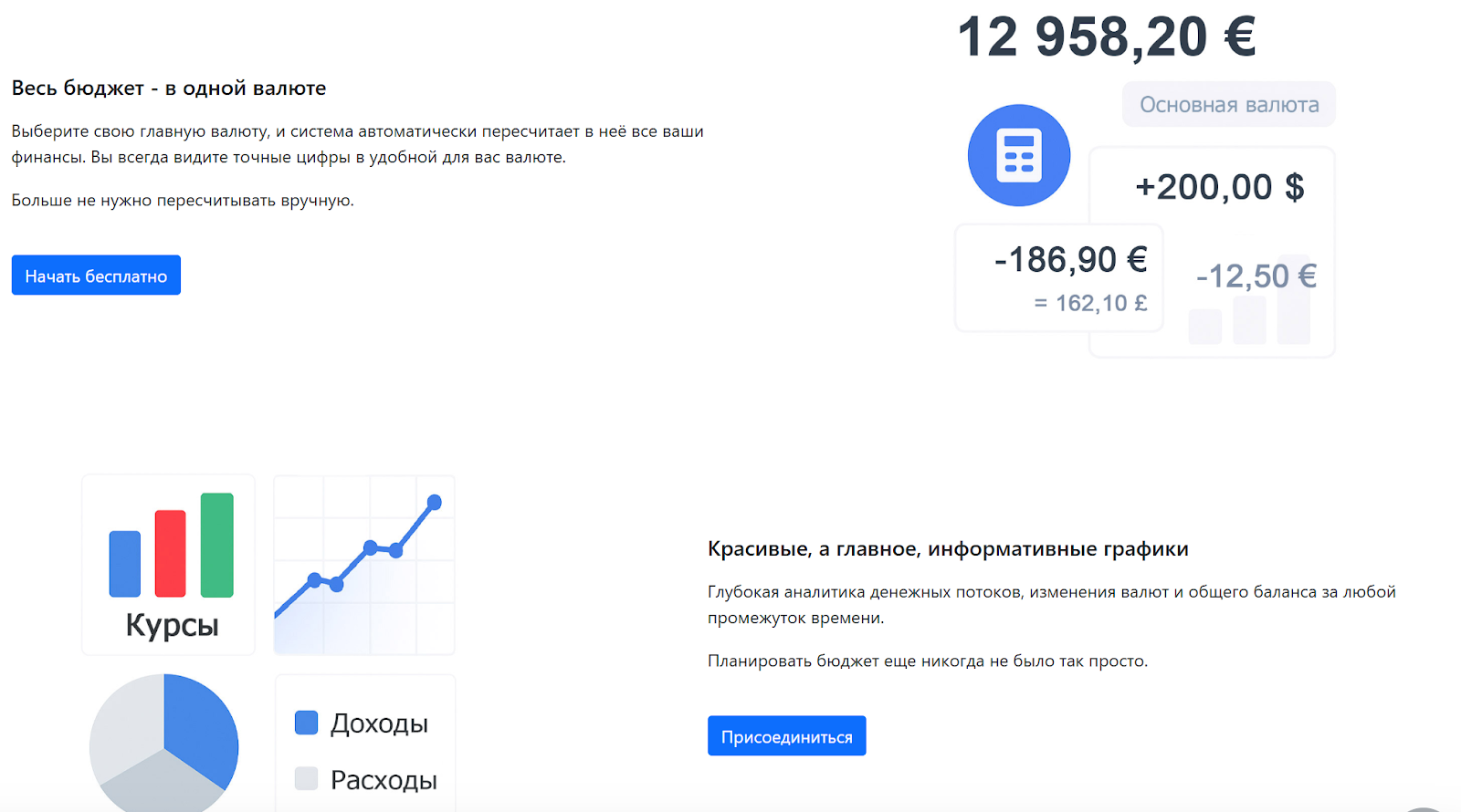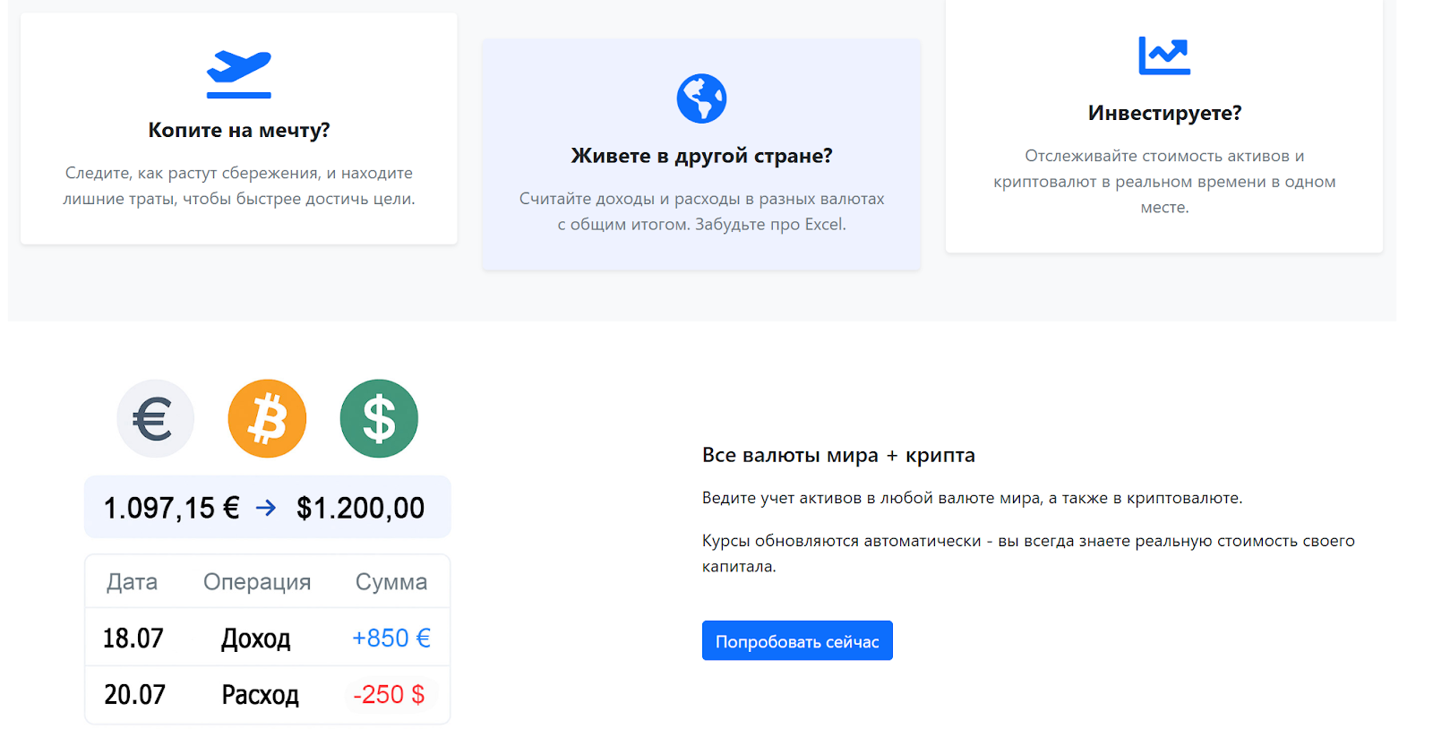 KeepMoney предоставляет платформу для ручного ввода и учета операций доходов и расходов в различных валютах. Включены фиатные валюты и ряд криптовалют. Для расчета стоимости активов курс обновляется автоматически. Пользователи создают учетную запись и получают доступ к бесплатному тарифу, где можно вести учет в трех валютах одновременно.