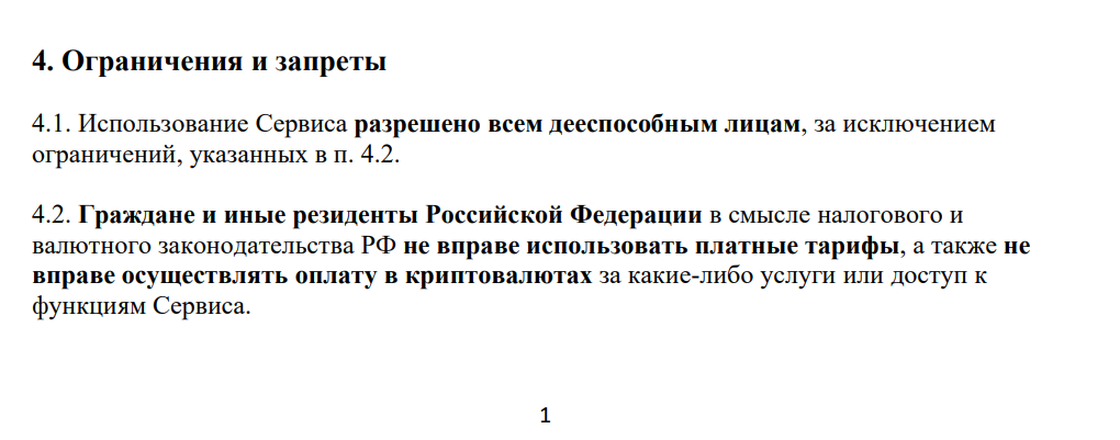 Также в оферте указано, что при возникновении споров применяется право страны проживания владельца сервиса, если стороны не договорятся об ином. При этом компания запрещает резидентам РФ использовать платные тарифы и производить оплату в криптовалюте. Также платформа блокирует доступ к платным функциям для IP-адресов из РФ.