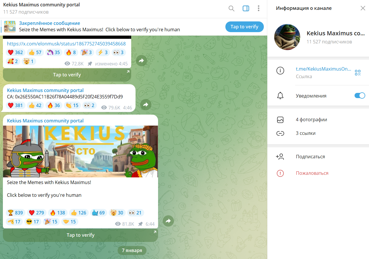 - Телеграм-канал: Kekius Maximus community portal или @KekiusMaximusOnEthportal