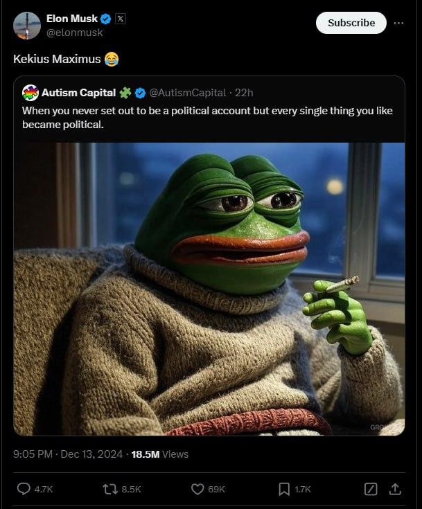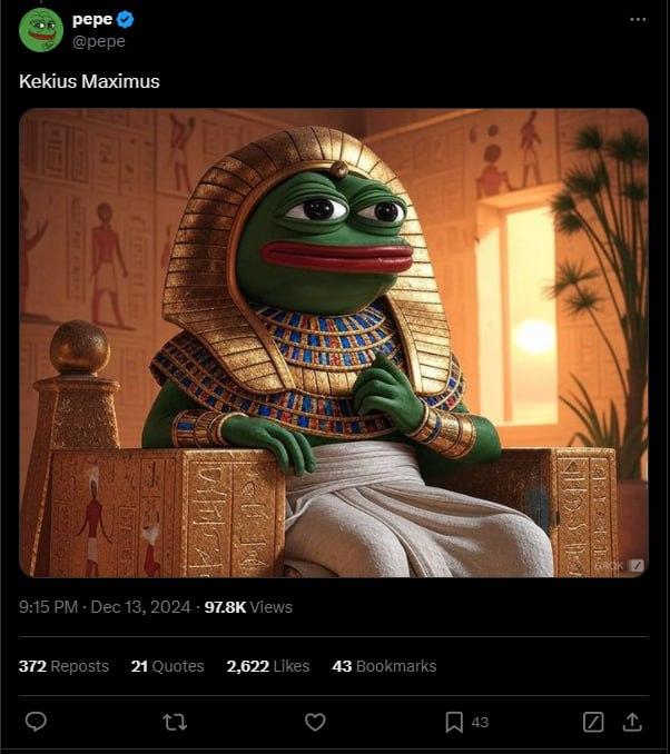 31 декабря 2024 года Илон Маск изменил имя в профиле Twitter на Kekius Maximus и установил аватар с изображением Лягушки Пепе в доспехах гладиатора. Это вызвало ажиотаж в криптовалютном сообществе и привело к резкому росту стоимости токена.