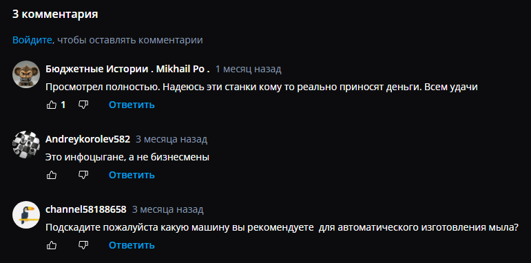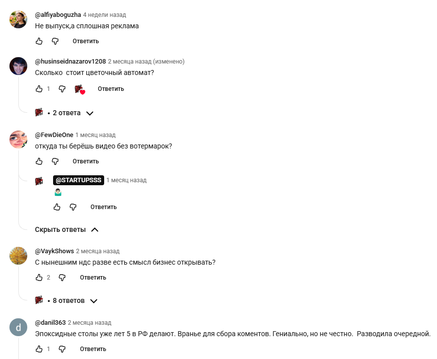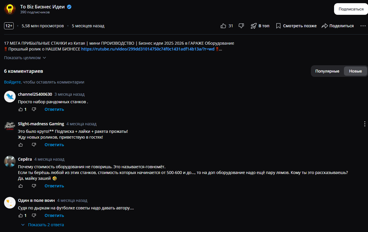 Мы изучили комментарии на Rutube под видеороликами, набравшими максимальное количество просмотров. Они посвящены закупке станков для производства из Китая. Зрители критически отнеслись к бизнес-идеям Кемрана. В своих комментариях они пишут, что ролик похож на рекламу. Некоторые подписчики указали, что автор не упомянул стоимость станков, а это очень важная для бизнесменов информация.