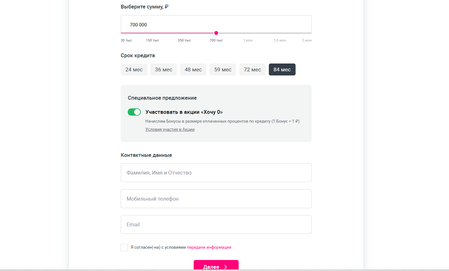 - выбрать сумму кредита. Разрешают брать от 30 000 рублей и до 2 млн рублей. Срок: 24 месяца, 36, 48, 59, 72 или же 84 месяца;
