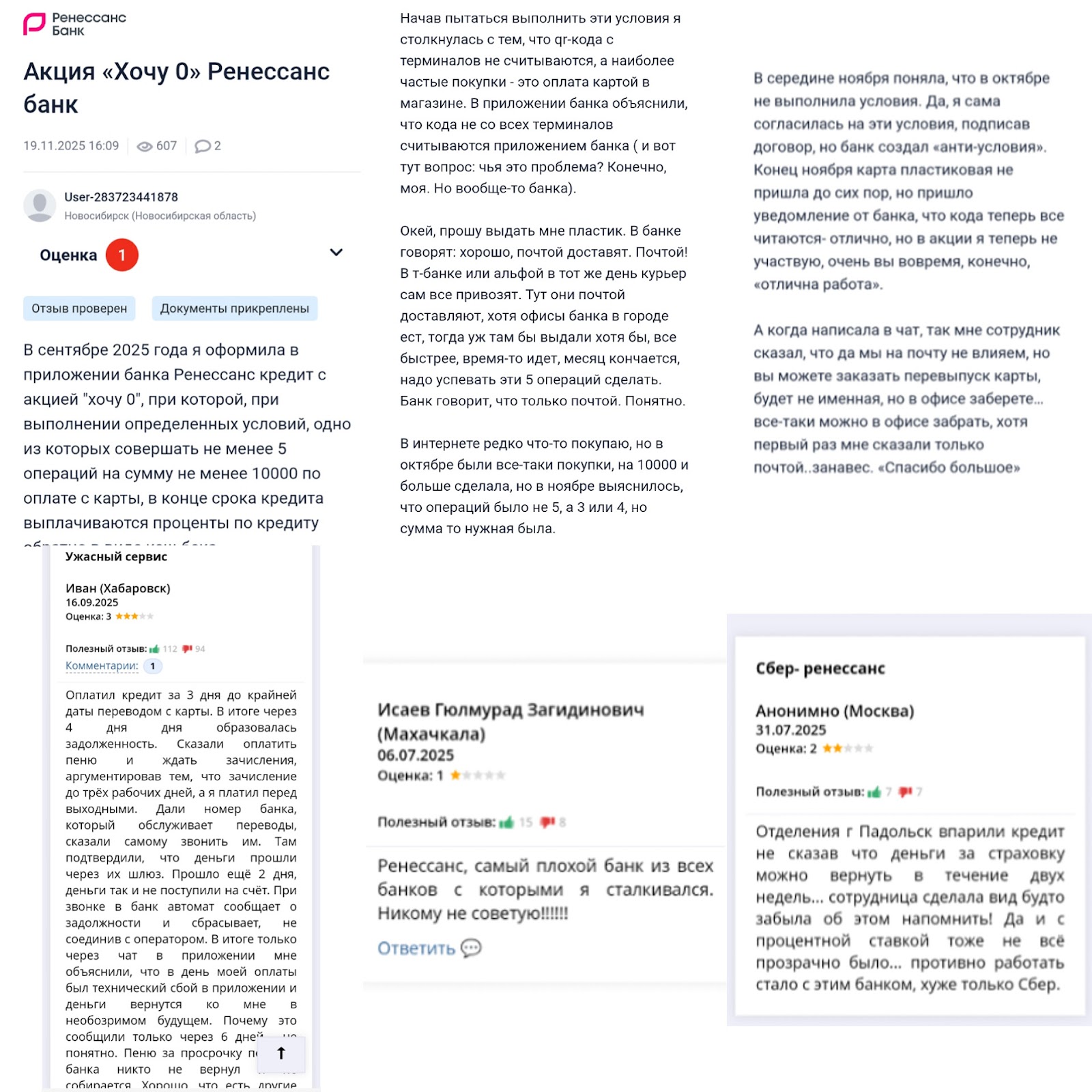 Также клиенты отмечают некорректные консультации сотрудников. Если вы брали кредит в рамках акции Хочу 0 от банка Ренессанс, можете оставить отзыв под обзором.
