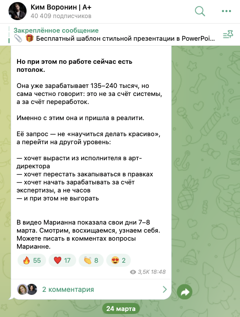 Почти весь контент на ТГК направлен на прогрев читателей с целью побудить их записываться на платное обучение организатора проекта. Профессиональных материалов, знания из которых можно было бы сразу применять на практике, в ленте канала нет.