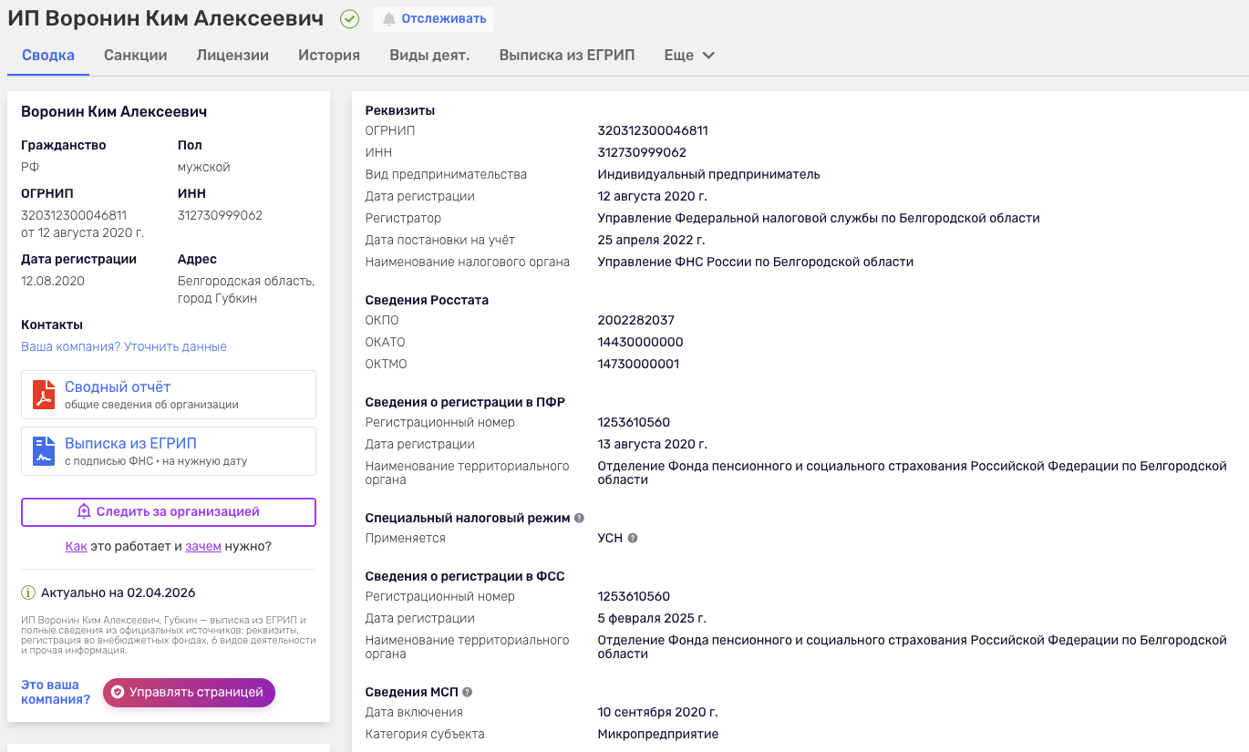 Собственную коммерческую деятельность эксперт ведет от лица ИП Воронин Ким Алексеевич. Зарегистрировано оно было в 2020-ом году.