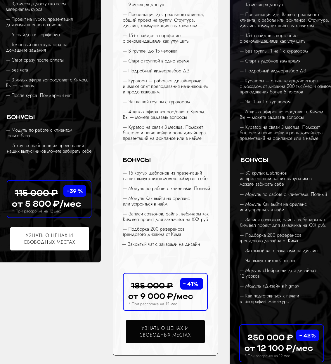 Предусмотрены три тарифных плана, которые отличаются между собой количеством бонусных материалов и сопутствующих услуг. Их стоимость варьируется от 115 до 250 тысяч рублей.