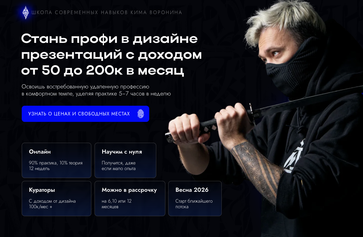 Свои услуги специалист по дизайну презентует на сайте School Kimvoronin, который располагается по адресу kimvoronin com. Актуальный на момент написания курс Кима Воронина — «Ниндзя». Тем, кто его пройдет, эксперт обещает, что они найдут работу с доходом от 50 до 200 тысяч рублей в месяц.