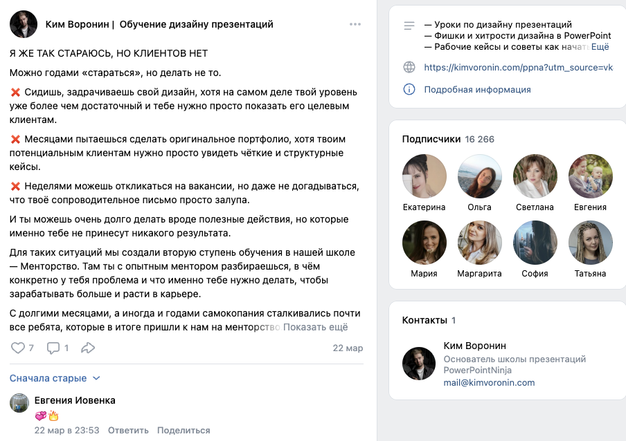 Другой информационный аккаунт эксперта — это страница «Ким Воронин Обучение дизайну презентаций», которая во «ВКонтакте» располагается по адресу kimvoronin. На нее подписаны 16,27 тысяч пользователей. Публикации получают до 10 лайков, а также 1-2 комментария.