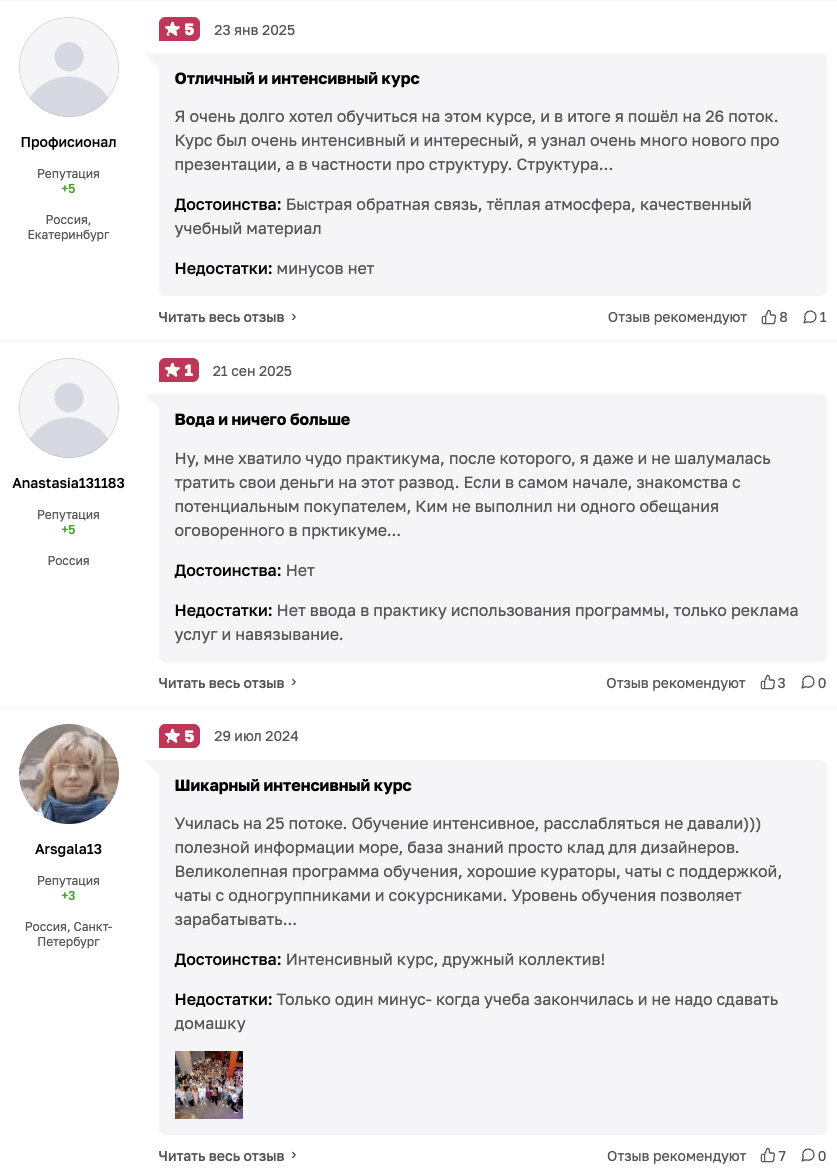 Отзывы о школе дизайна Кима Воронина, а также его курсах по дизайну, нейросетям и пр. являются смешанными. Авторы позитивных ревью утверждают, что им понравилась хорошая структурированность материалов, быстрая обратная связь и теплое отношение кураторов.
