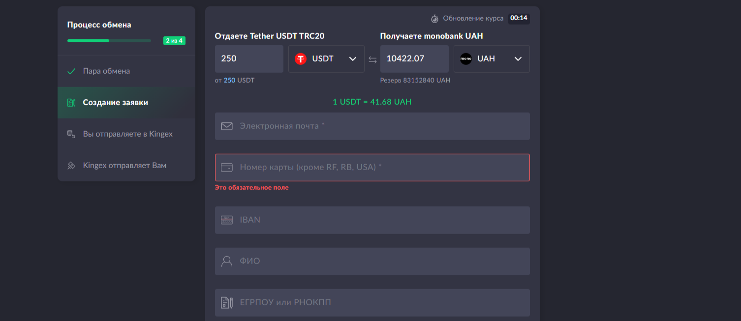 Сам процесс состоит из нескольких этапов: пользователь выбирает пару, создает заявку, в которой заполняет все необходимые данные. Далее он отправляет имеющуюся у него крипту или фиатные деньги на указанные обменником реквизиты и получает требуемый актив на свой кошелек или счет.