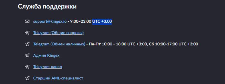 Из имеющихся средств связи на сайте указаны: адрес электронной почты, телеграм-аккаунты и онлайн-чат. При выборе первого варианта нужно учитывать, что техническая поддержка отвечает на письма с 9:00 до 23:00. Через ТГ можно связаться с администратором обменника, старшим AML-специалистом, а также по общим вопросам и с просьбами обмена наличных. Также существует бот-помощник, который можно найти по нику в ТГ @kingex_support_bot.