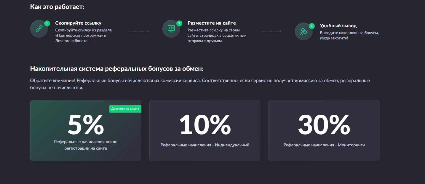 У пользователя есть возможность заработка на рекомендациях сервиса в интернете. Для этого ему нужно зарегистрироваться на сайте и создать свою первую заявку на обмен. После этого в личном кабинете станет доступна реферальная ссылка. В качестве наград предусмотрены реферальные начисления в размере 5%, 10% и 30% от комиссии сервиса за обмен.