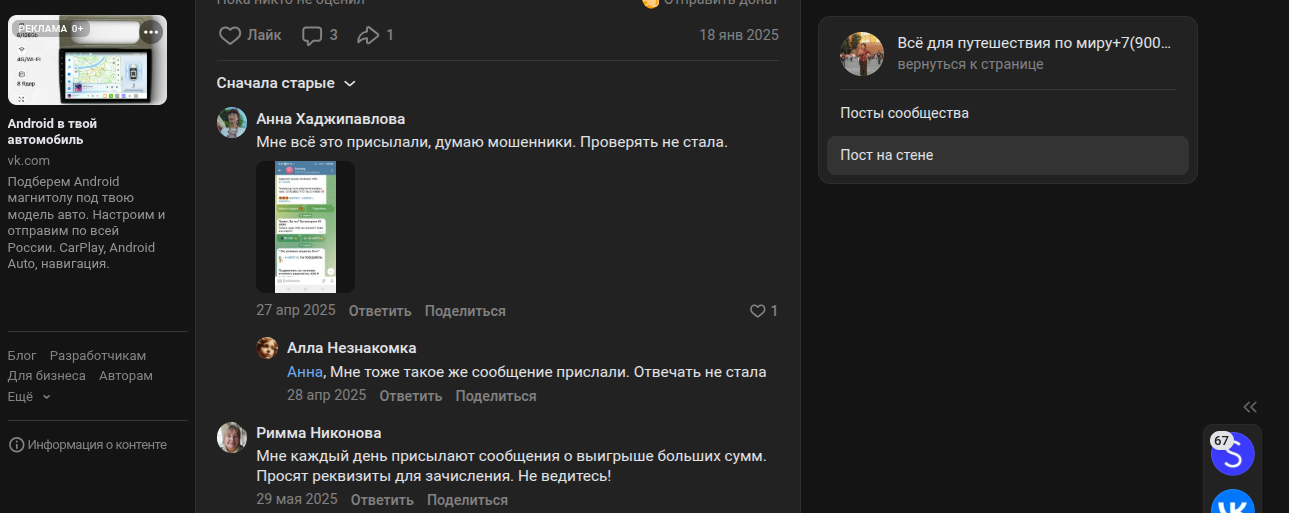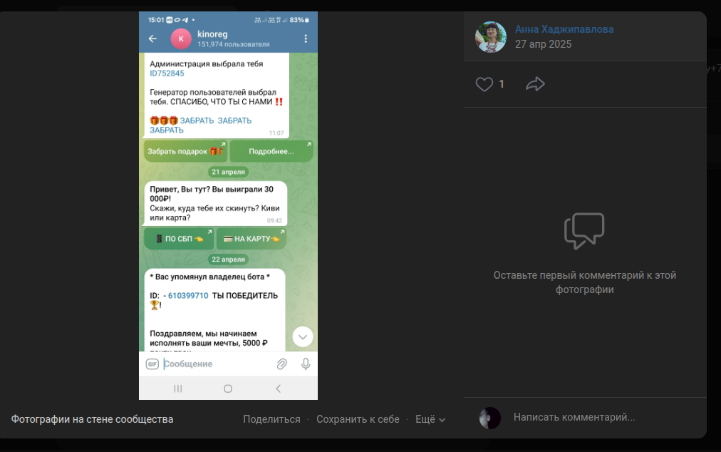 Кроме всего перечисленного, в одном паблике «Все для путешествия по миру» во «Вконтакте» мы нашли упоминание про рассылку. В нем подписчик отмечает, что бот рассылает предложения с выигрышем денег. Бот Kinoreg bot пишет, что пользователь якобы выиграл от 30 000 рублей, и надо перейти по ссылке, чтобы их получить.
