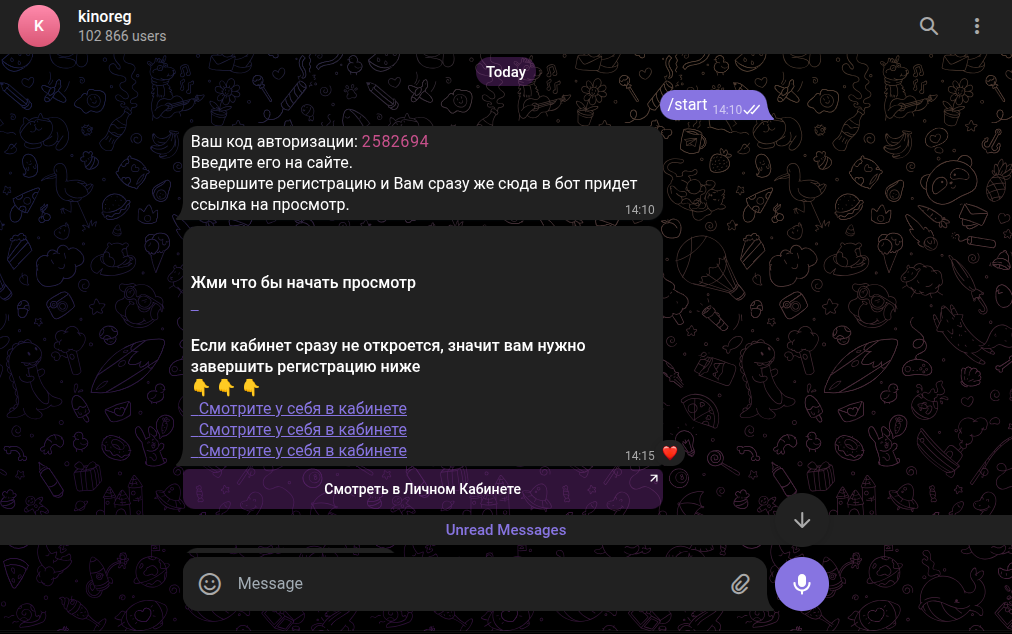 Если немного подождать, то программное обеспечение Kinoreg bot начнет спам-рассылку рекламы пабликов и сайта с новиками кино — https:// ugk x1te cfd/o/Yo1ZtOuy. Переходить по ней не советуем, потому что через токен запроса разработчики могут украсть ваш аккаунт телеграма.