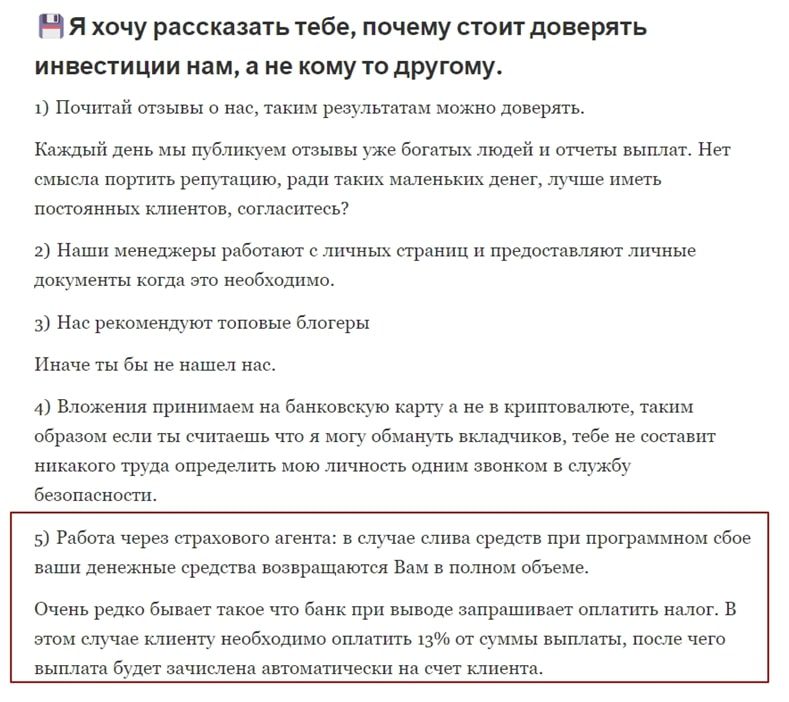 Кирилл Шевченко для пользователей канала создал инструкцию, в которой четко прописал, что иногда для вывода заработка требуется оплата налога. Также мошенник утверждает, что работает через гаранта, услуги которого платные. Понятно, что таким способом аферист пытается выжать с инвесторов все по максимуму.