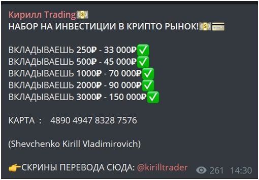 Как заявляет Кирилл Шевченко инвестиции, его заработок построен на арбитраже – покупке и продаже криптовалюты на разных биржах по разным курсам. Чтобы привлечь инвестиции в лохотрон автор ведет сообщество в Телеграме Кирилл Trading, где с 2021 года успел накрутить почти 13 тысяч подписчиков.