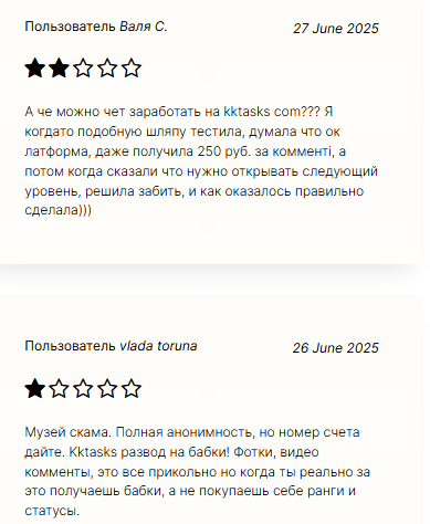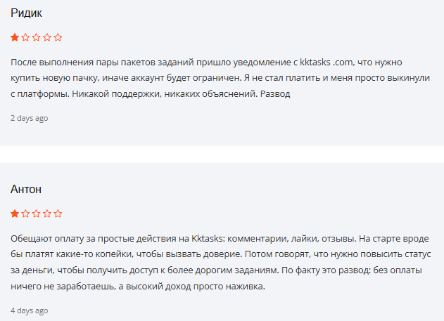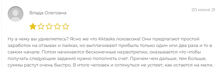 Комментарии в основном негативные в сети. В целом, kktasks люди характеризуют как лохотрон. Часто пользователи сообщают о своих неоправданных ожиданиях. Что после регистрации они или не получали обещанные задания, или от них сразу требовали дополнительных инвестиций.