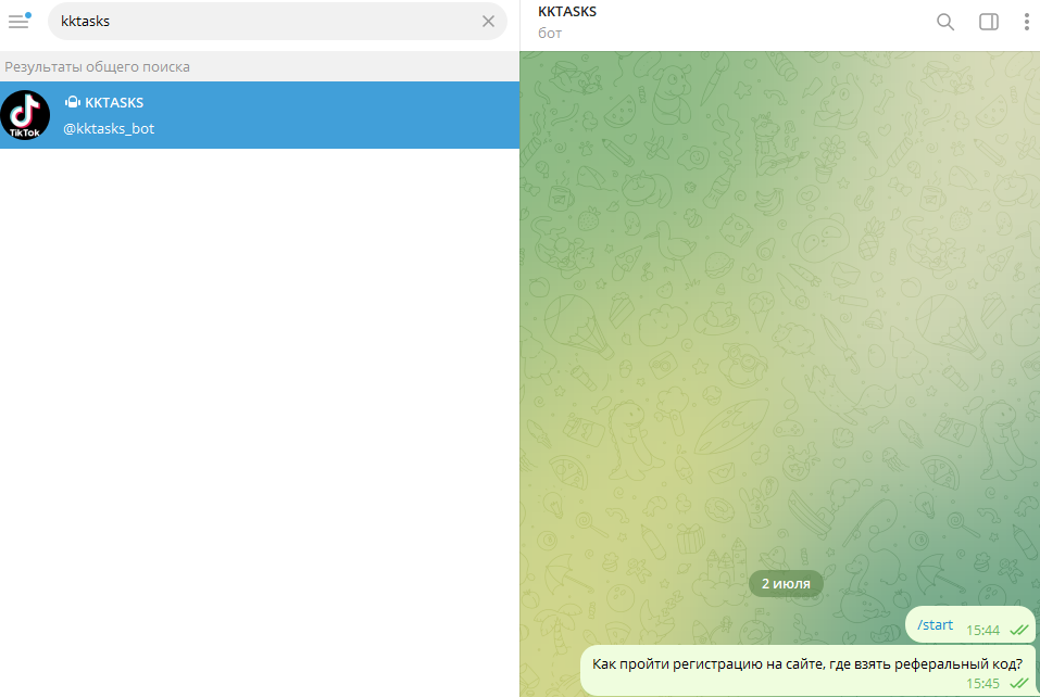 Мы обратились к Телеграм боту Kktasks с вопросом, где нам взять реферальный код для формы регистрации на сайте? Никакого ответа, к сожалению, мы не получили. Так что задача оказалась невыполнимой, несмотря на ее кажущуюся легкость.