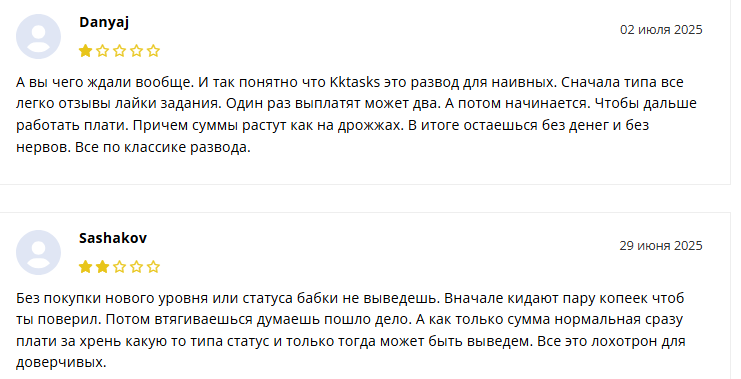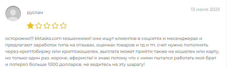 Некоторые инвесторы жалуются на kktasks из-за сложности вывода денег, их отзывы описывают отчаянные попытки связаться со службой поддержки. Отметим, что комментарии обычно написаны людьми, потерявшими свои средства в этом проекте.
