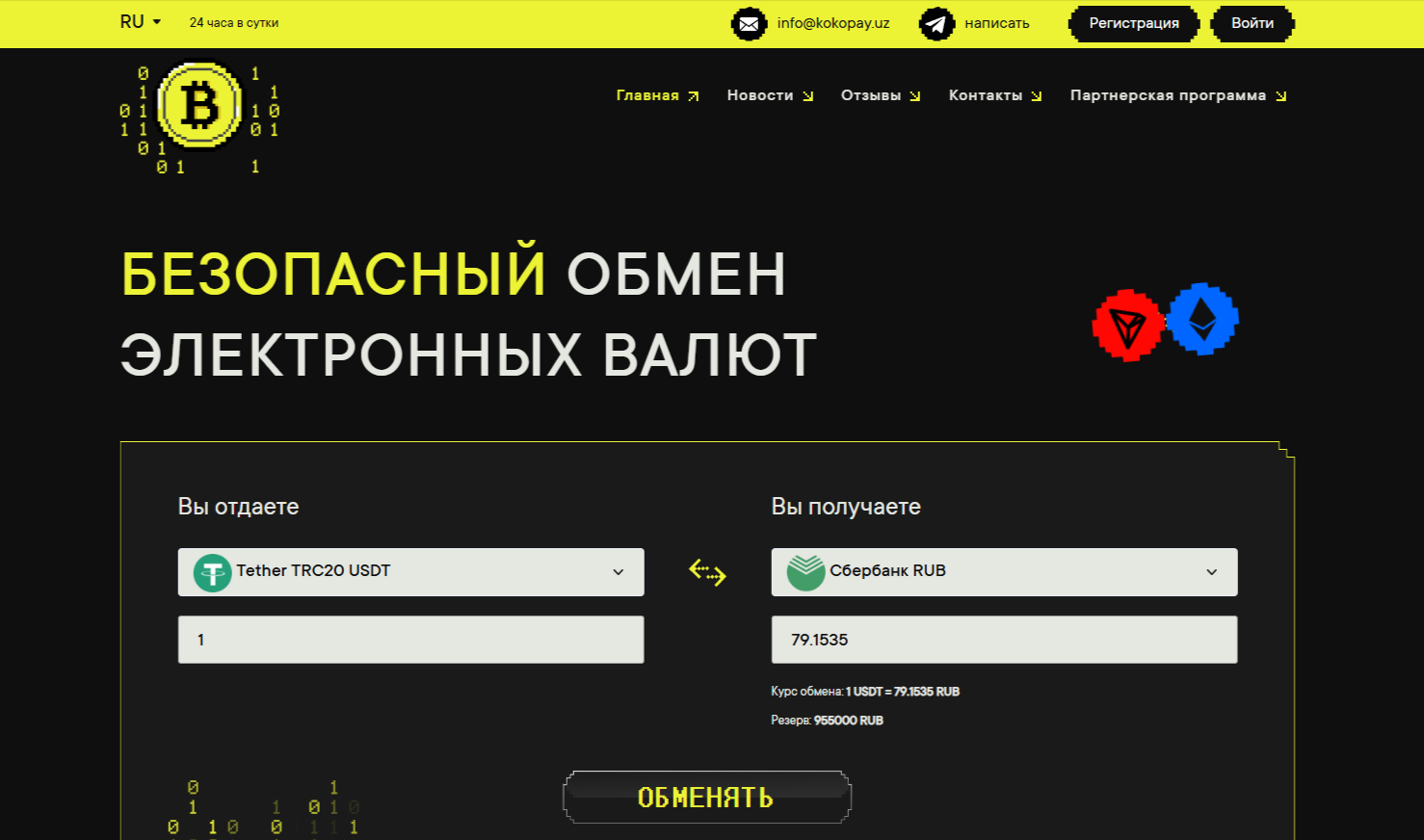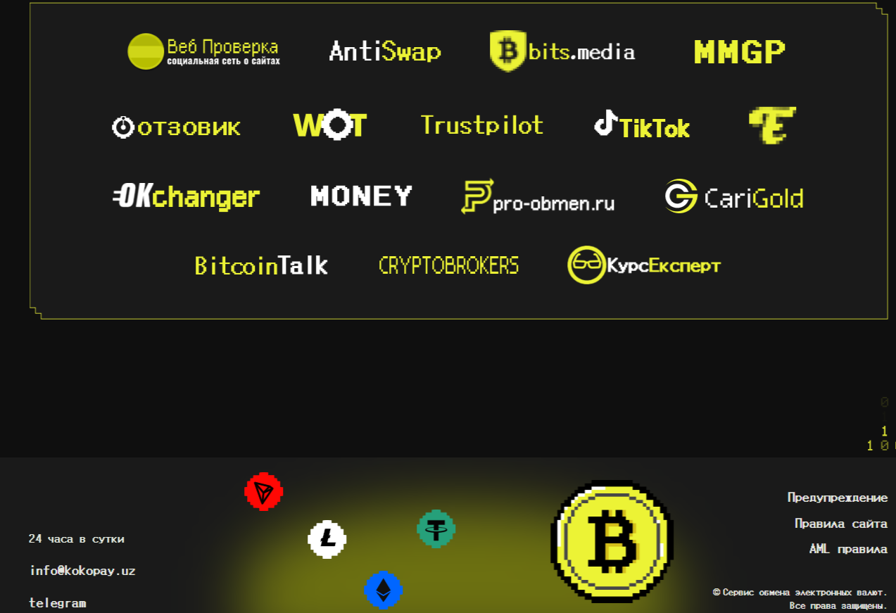 Мы не рекомендуем сайт kokopay uz для обмена цифровых монет. Высоки риски утраты клиентских средств и утечки информации. Хотите обменивать криптовалюту быстро, безопасно и выгодно – обращайтесь к надежным платформам. Каким – наши экспертные статьи укажут верное направление сотрудничества.