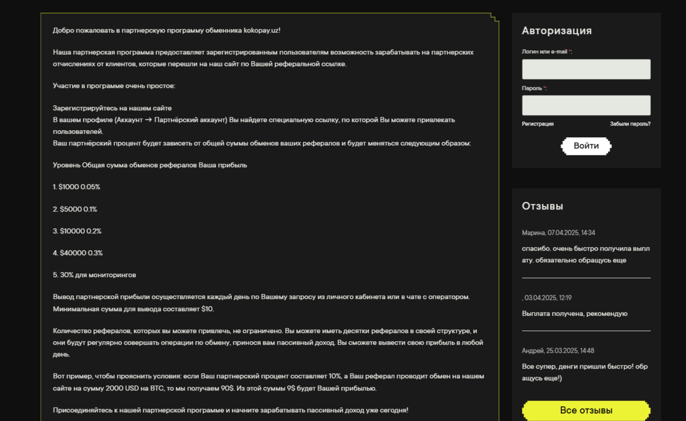 Единственная финансовая информация на портале – данные о партнерской программе с пятью уровнями. В рамках партнерки клиенты криптообменника могут получать от 0,05 до 0,2% за платежи своих рефералов. Партнерам-мониторингам обменный пункт выплачивает 30%.Обзор веб-сайта обменника kokopay uz