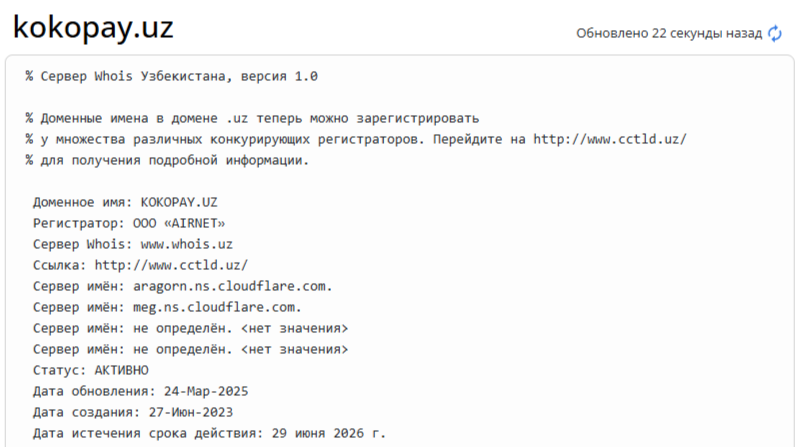 Домен kokopay uz был создан 27 июня 2023 года. 24 марта 2025 года было обновлено ПО сайта. Владельцы модернизировали портал, но не разместили на нем полезных ссылок, подтверждающих легальность деятельности или обеспечивающих определенные гарантии клиентам.