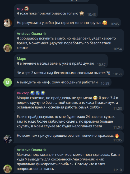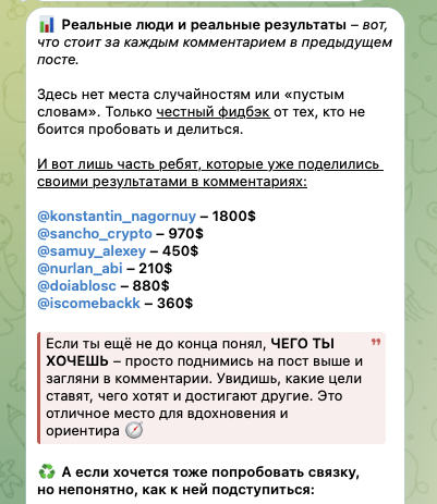 В качестве доказательств тому, что его методика работает, инвестор перечисляет успехи своих последователей. В этих сообщениях присутствуют ссылки на конкретных пользователей. Никаких доказательств тому, что это реальные клиенты, а не просто аккаунты, которые созданы самим организатором проекта, нет.