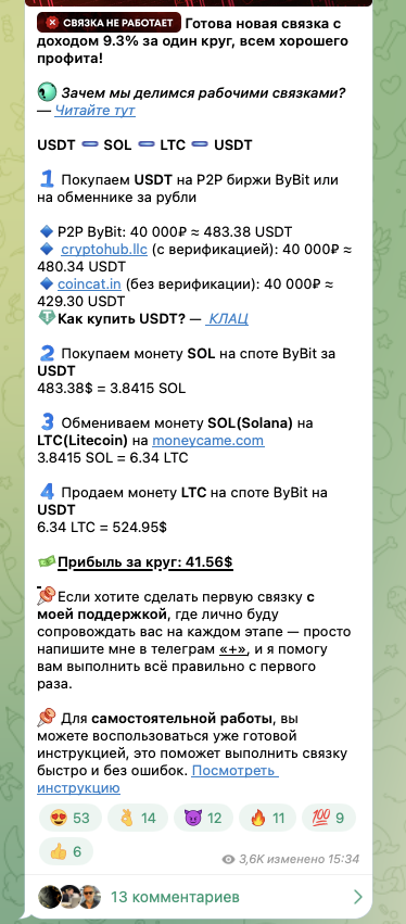 «Контроль курса» — тг-канал, владелец которого предлагает своим подписчикам пользоваться его арбитражными связками. Утверждает, что благодаря им можно получать до 10% прибыли за круг.
