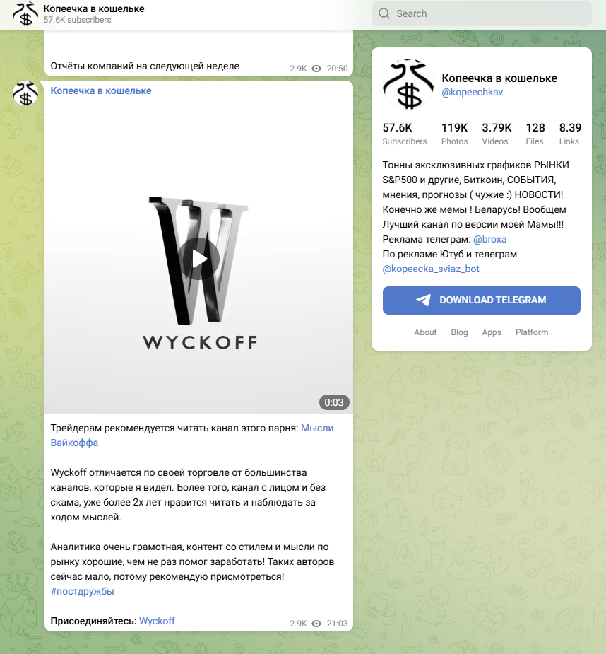 В “Телеграмм” “Копеечка” публикует эксклюзивные графики рынков. В постах канала имеются прогнозы и новости криптовалютной сферы. Есть и ряд других публикаций, комментарии закрыты.