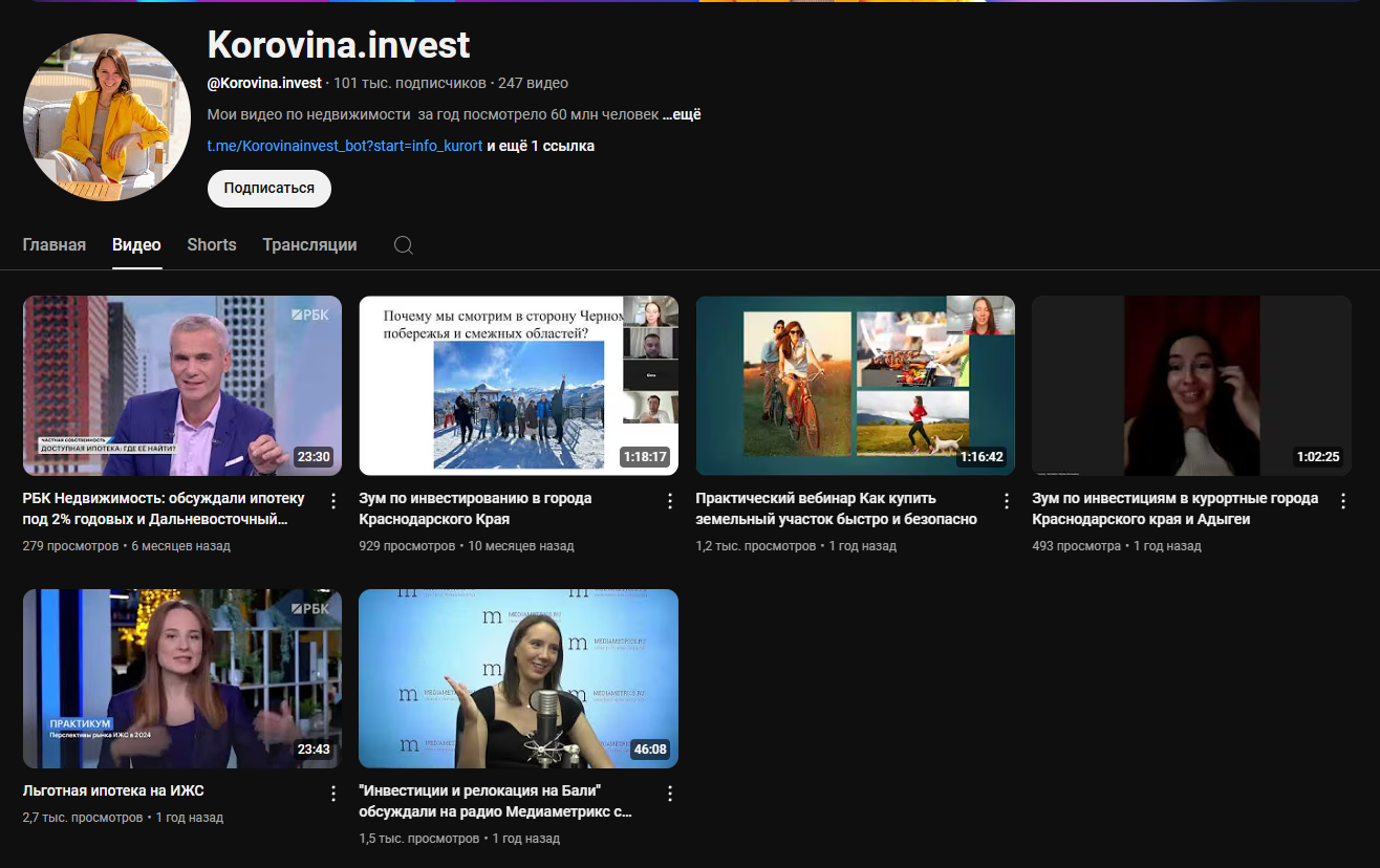 У проекта Коровина Инвест также есть и ютуб-канал, заслуживающий внимания. Интересен он тем, что имеет более 100 тыс. подписчиков. Казалось бы, показатель очень серьезный, но если взглянуть на видео, то возникают вопросы. Общее число роликов на канале – 6, последний был опубликован несколько месяцев назад – у всех совсем небольшие просмотры. Каким образом здесь появилась 100-тысячная аудитория, остается загадкой.