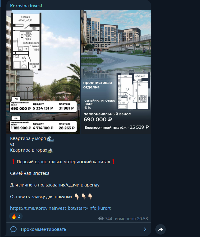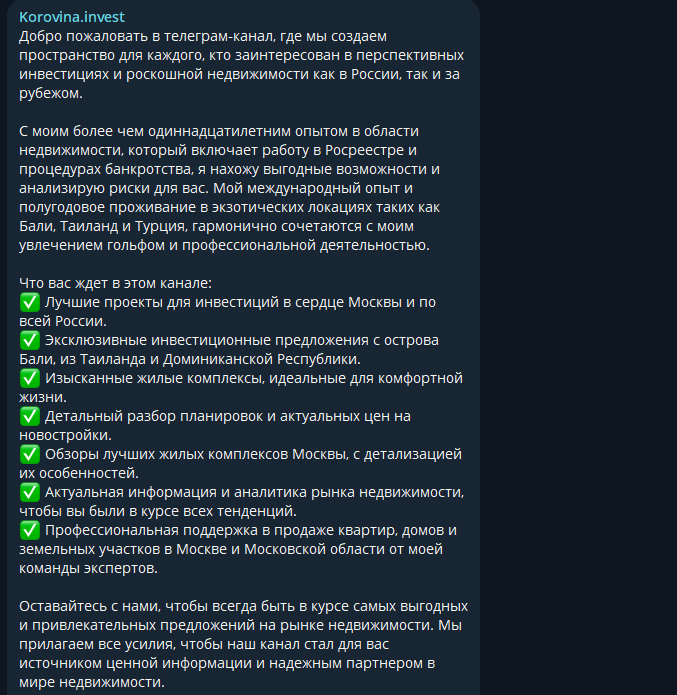 В закрепленной публикации Korovina Invest людям обещают регулярное размещение постов с разной направленностью: от выгодных проектов, в которые можно вложиться, до актуальной информации с рынка недвижимости и разбор различных объектов. Однако на деле найти здесь можно лишь небольшую часть от того, что здесь было упомянуто.