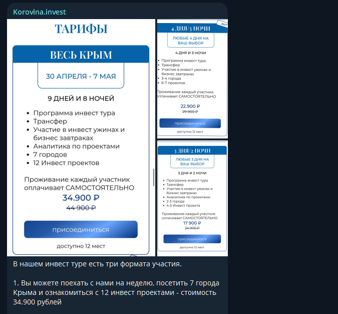 - пользователям также предлагаются инвест-туры, реальная стоимость которого примерно в 3 раза ниже;