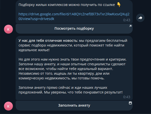 После вступления в сообщество каждому приходит автоматическое сообщение от телеграм-бота Дарья Коровина Подбор недвижимости Москва. И хоть в первом сообщении клиенту предлагают просто получить подарок, однако на деле отправляют довольно посредственную подборку, чтобы затем постоянно спамить рекламными предложениями.