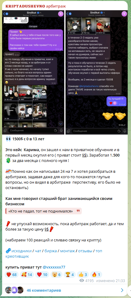 На канале, посвященному арбитражу трафика, постоянно выкладывается реклама обучения, а также результаты, которых удалось добиться админу за счет создания хайповых видео. Для подписчиков доступен канал ИСХОДНИКИ «KRIPTADUSHEVNO», на котором размещаются разного рода короткие видеоматериалы для дальнейшего создания коротких видео для Ютуб и ТикТок.