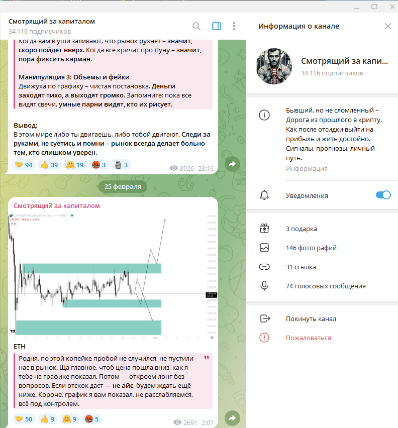 Единственный канал, который имеет отношение к крипте – Смотрящий за капиталом. На него подписано более 34 тысяч пользователей. Однако публикации просматривает около 10% подписчиков.