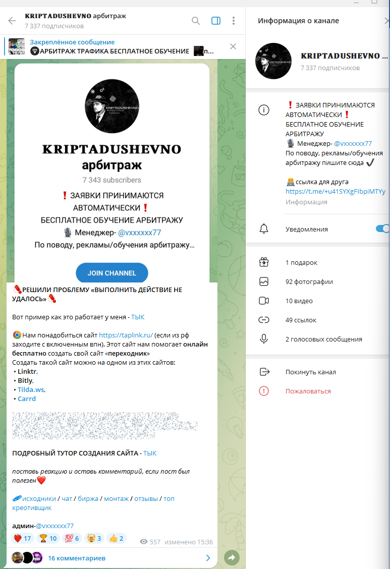 KRIPTADUSHEVNO – сеть Телеграм-каналов, которые сочетают в себе обучение трейдингу, арбитражу трафика. В целом эти направления деятельности любят разного рода мошенники. Поэтому мы решили проверить особенности работы данного проекта, оценить качество предоставляемых услуг.