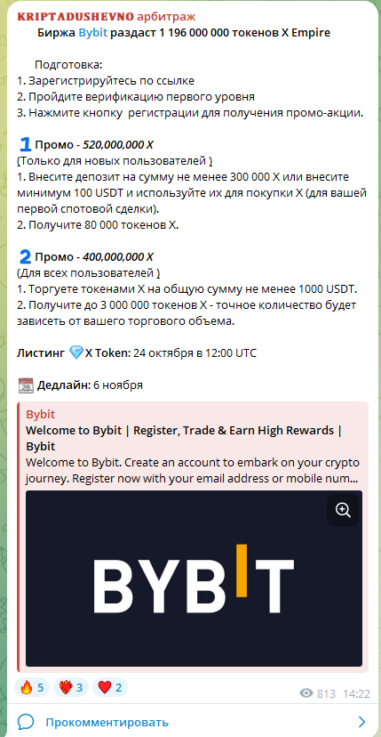 Примечательно, что арбитраж не имеет никакого отношения к арбитражу крипты. Поэтому название сети KRIPTADUSHEVNO можно объяснить лишь тем, что админ, судя по всему, льет трафик на криптобиржи. На это указывают редкие рефералки на самом канале: