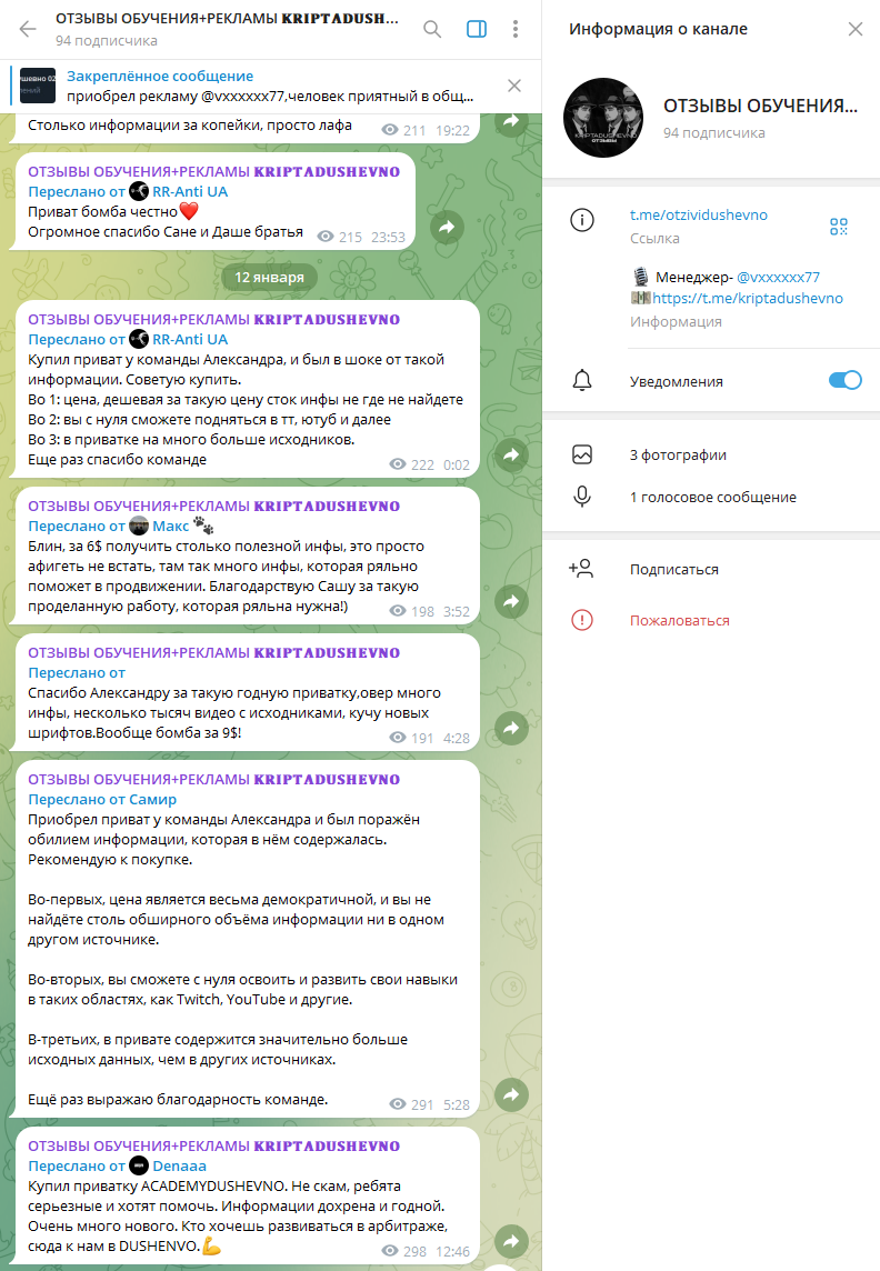 Основной продукт, который продают авторы канала – платный приват за 9 USD в месяц. Под него выкладывают отзывы довольных пользователей. Создан даже отдельный канал с отзывами: