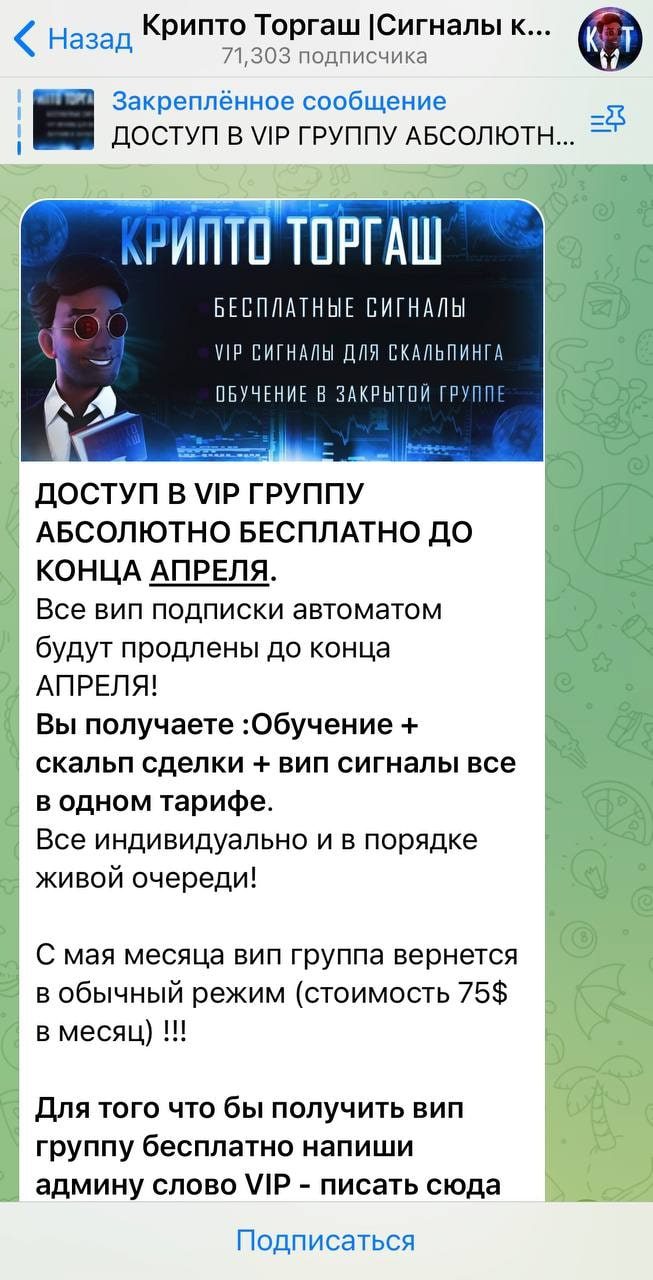 Крипто Торгаш — это информационный блог, посвященный миру криптовалют и торговли токенами. Коммерсант предлагает своим читателям актуальные новости из мира цифровых валют, советы, уроки и рекомендации по торговле. Также он рекламирует платную ВИП-группу, в которой обещает публиковать высокопроходимые сигналы и полезные инсайды. Но статистику с этой ленты он подделывает. Кроме того, пользователи уверены, что ресурс ведет мошенник.