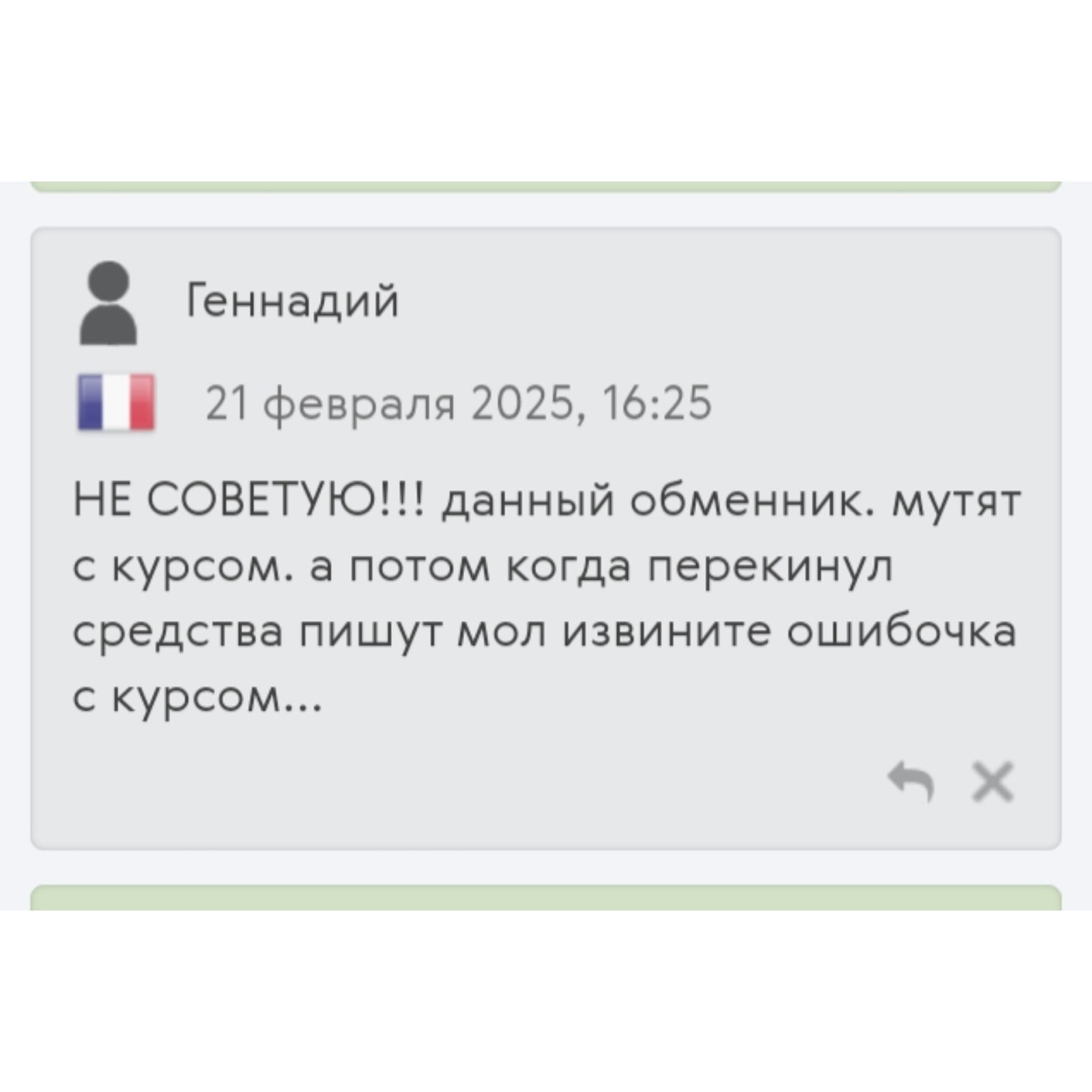 Рассматриваемый криптообменник работает недавно, и у него отсутствует лицензия. Исходя из правил, сервис может отменять транзакции и вносить изменения в условия работы в любой момент. В основном пользователи довольны работой обменника, однако некоторые клиенты жалуются на резкие изменения курсов после переводов. Из главного о проекте мы выделили: