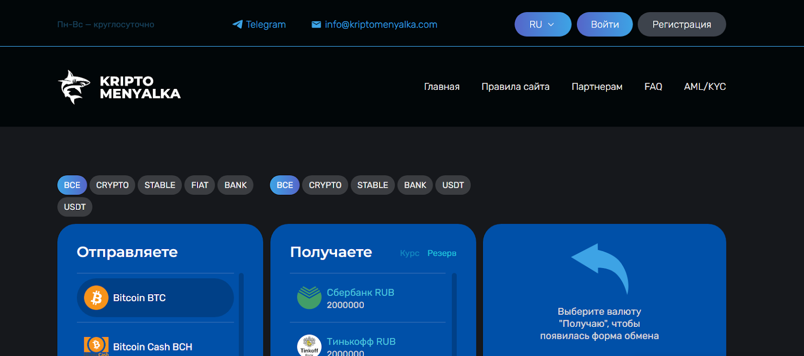 Криптоменялка — это онлайн-сервис, который предлагает обменивать разные криптовалюты и фиатные средства. Клиентам обещают быстрые финансовые операции, надежность, а также поддержку от специалистов. По словам основателей, пользователи получат доступ к акциям и реферальной программе, и далее мы расскажем об обменнике подробнее.