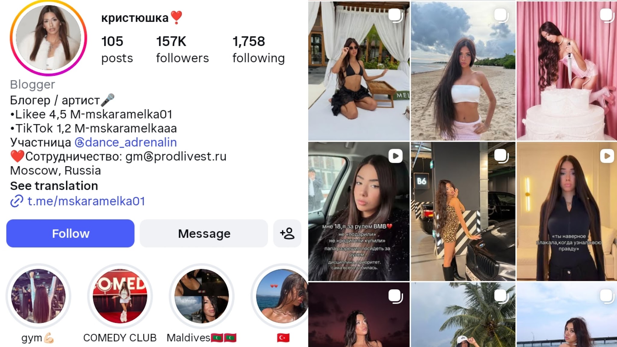 На странице публикуются афиши мероприятий Кристины, ее танцы и прочее. Также у блогера есть каналы в Ютубе и ТикТоке.